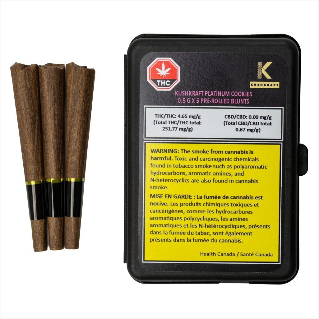 Platinum Kookie Blunts are an indica-dominant strain featuring a sophisticated flavour profile: hints of fresh earth and coffee balanced with a sweet aroma of dried fruit. The blunt paper’s trademark smell, taste and smoke matches a blunt paper profile for that classic blunt experience. PK’s dense trichome-rich buds are coated with resin and even crackle when broken apart.